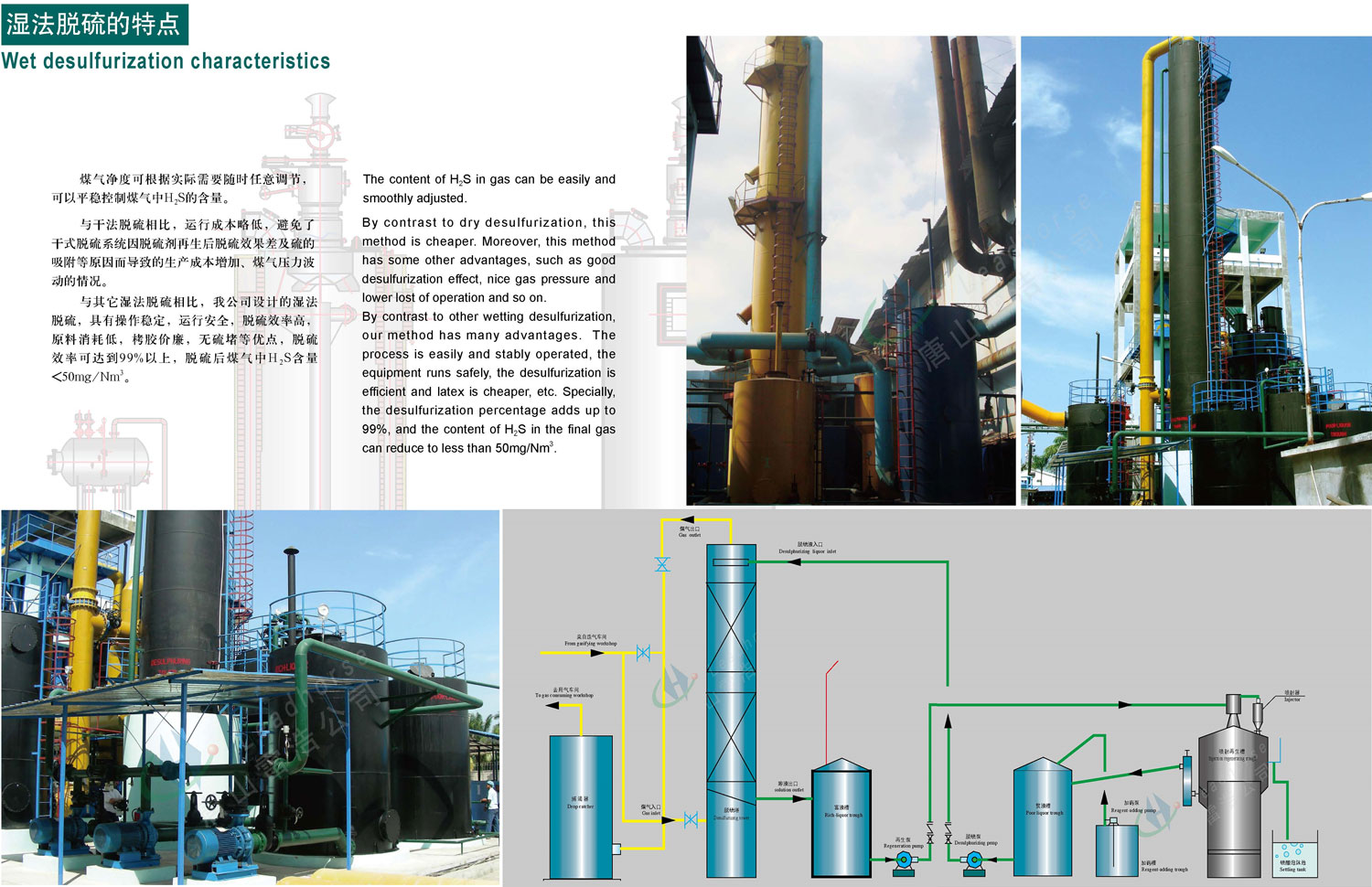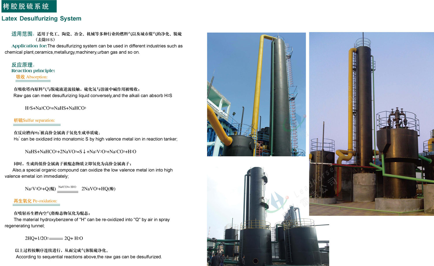 適用范圍:適用于化工、陶瓷、冶金、機械等多種行業的燃料氣以及城市煤氣的凈化、脫硫(去除H2S) 反應原理:(1)吸收:在吸收塔內原料氣與脫硫液逆流接觸,硫化氫與溶液中堿作用被吸收;H2S+Na2CO3=NaHS+NaHCO3 (2)析硫:在反應槽內Hs被高價金屬離子氧化成為單質硫;NaHS+NaHCO3+2NaVO3=S↓+Na2V2O5+Na2CO3+H2O同時,生成的低價金屬離子被醌態物質立即氧 化為高價金屬離子;Na2V2O5+Q(醌)NaCO3+H2O 2NaVO3+HQ(酚) 再生氧化:在噴射再生槽內空氣將酚態物氧化為醌態;2HQ+1/2O2 2Q+H2O 以上為過程按順序連續進行,從而完成氣體脫硫凈化。